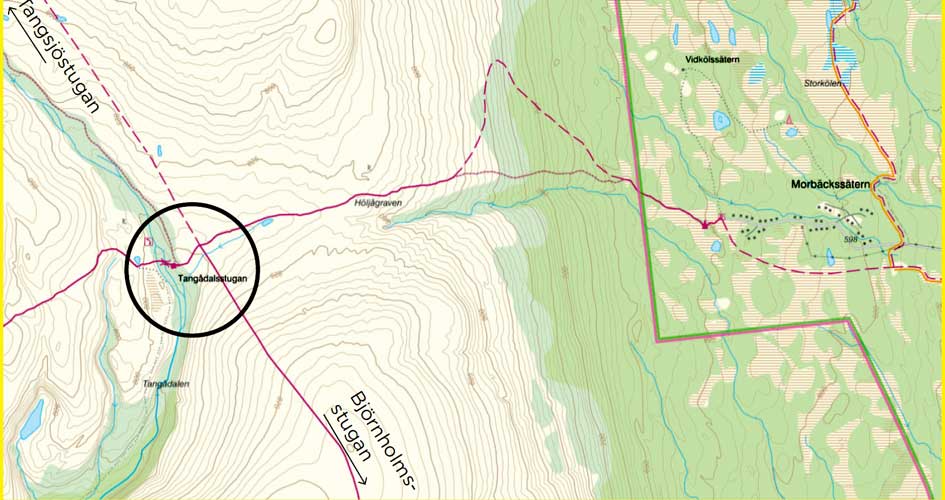 Rast- och övernattningsstugan i Tangådalen är tillsvidare avstängd. Stugan har tillträdesförbud då den är angripen av hästmyror som kan ha försvagat konstruktionen. Nödtelefonen är flyttad till utsidan av stugan.